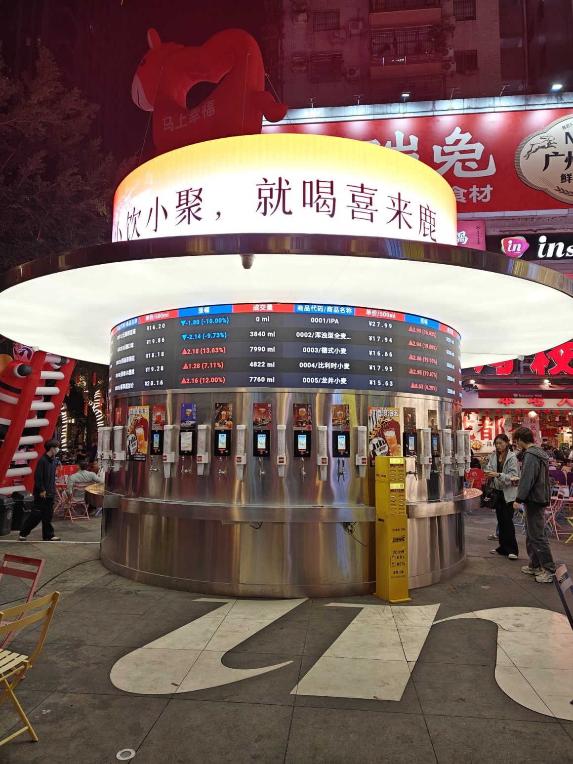 For nightlife, the Tiyu Xilu area (West Tiyu Road) felt young and busy—people spilling out of the metro, meeting friends, moving in groups. Not romantic, just alive. I had a beer at the Qingdao Beer Exchange with some intestine snacks from one of the food outlets. You choose your beer and swipe on WeChat, though there isn’t much to choose from—it’s more focused on aromatic punch drinks than beer. Very affordable, though.