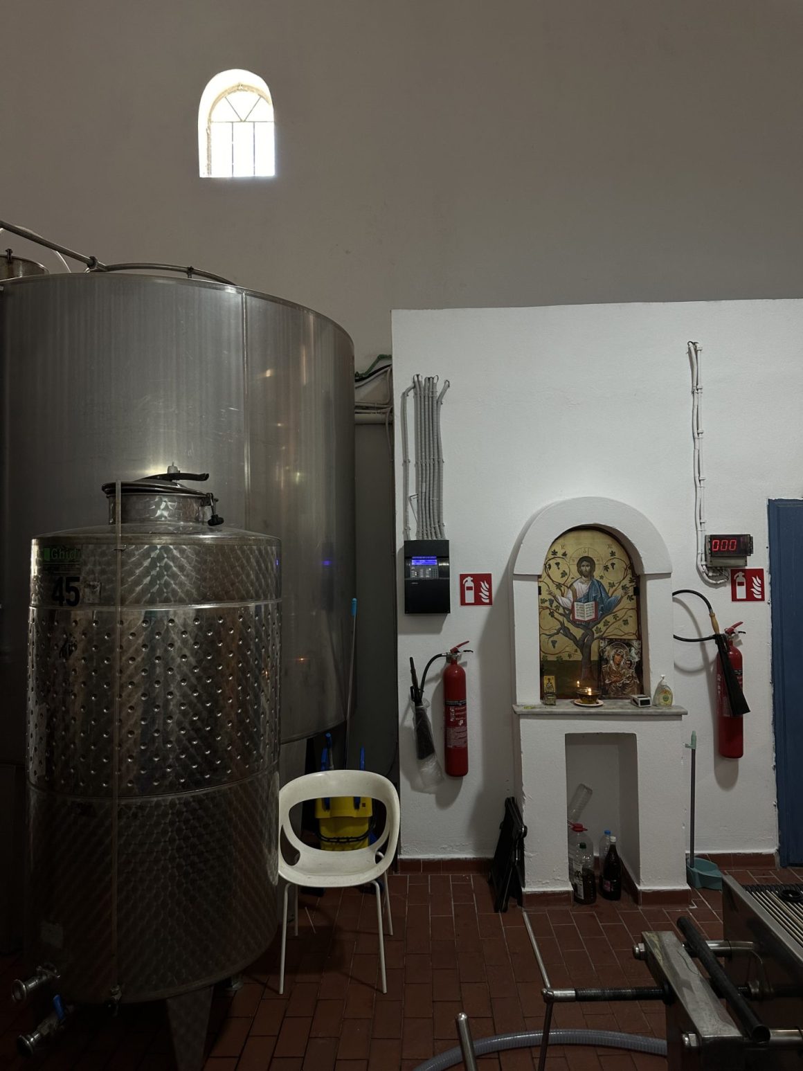 On the eastern coast, between Kamari and Monolithos, Gaia Wines stands right by the sea. This stone building, dating back to the early 20th century, once processed local cherry tomatoes; today, it produces Assyrtiko—precise, high-energy, saline, with a recognizable volcanic signature. Under the white arches are amphorae, steel tanks, and old wood barrels. And under the water? Cases of Assyrtiko undergoing sea aging!